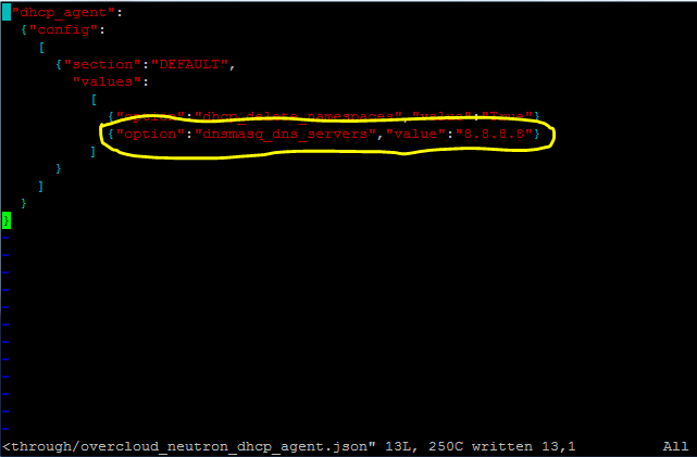 14. Edit the overcloud_neutron_dhcp_agent.json file located in the installation media (tripleo/hp_passthrough/overcloud_neutron_dhcp_agent.json) to include the following line replacing 8.8.8.8 with your DNS server details.
